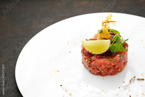 A salmon tartar on an elegant white plate, on a black stony background. Appetizer prepared from fresh raw salmon and seasonings, decorated with lime wedge.