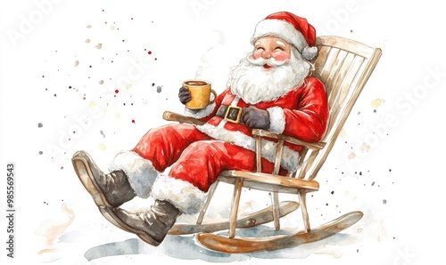 A santa claus is sitting in a rocking chair with a cup of coffee