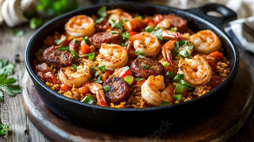 A savory dish of shrimp and rice with sausage.