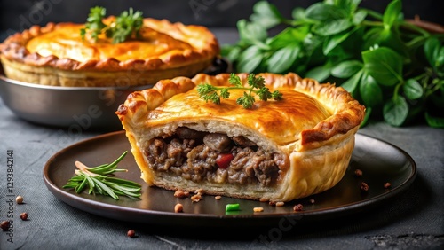 A savory meat pie with a double layer of flaky puff pastry crust, containing ground beef and topped on a dark plate