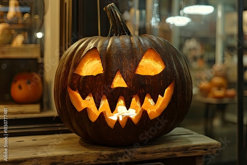A scary spooky glowing carved halloween pumpkin lantern, Jack O' Lanterns,with generative ai