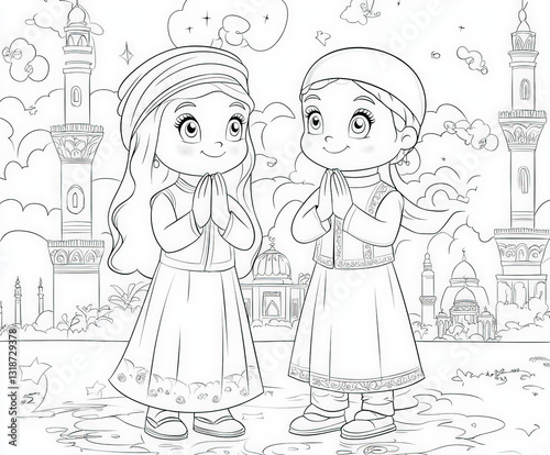 scene, importance, prayer, islam, colouring, page, children, simple, outline, illustration, book, mosque, arabic, children, culture, drawing, dress, faith, garment, girl, islamic, muslim, praying, religion, vignetting, tradition, turban