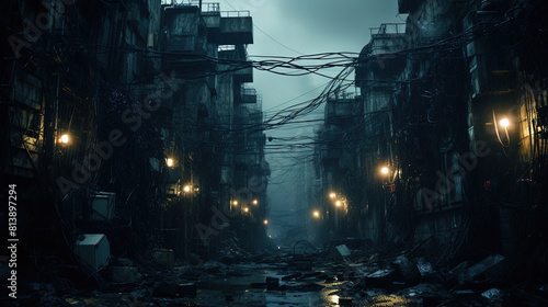 wire, landscape, dark, city, fog, foggy, sky, night, black, modern, digital, dirty, light, industrial, old, decay, wet, rain, grunge, street, system, road, equipment, destroyed, broken, urban, architecture, creepy, ruin, empty, abandoned, destruction, rust, structure, construction, technology, smoke, path, light