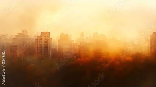 A scenic autumn view from a window, city rooftops and golden leaves under a soft, diffused morning light, seasonal and inviting