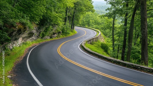 A scenic highway with sharp turns through sunlit mountainous terrain.