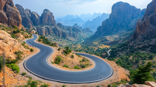 A scenic road trip through a mountainous region with winding roads, picturesque landscapes, and a convertible car, capturing the thrill of adventure travel