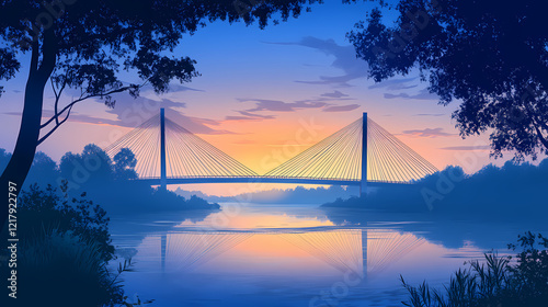 A scenic view of a cable-stayed bridge at dusk over a calm river. Twilight Bridge. Illustration