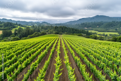 A scenic view of a lush vineyard with rows of green vines under a cloudy sky, set against rolling hills and a picturesque landscape.