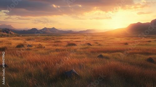 A scenic view of savannah grasslands with rugged terrain and distant mountains, bathed in the warm glow of a setting sun.