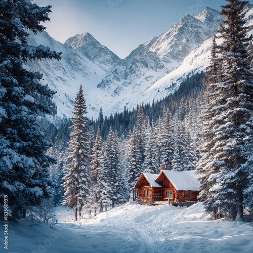 A scenic winter mountain landscape with a cozy wooden house nestled among snow-covered pine trees