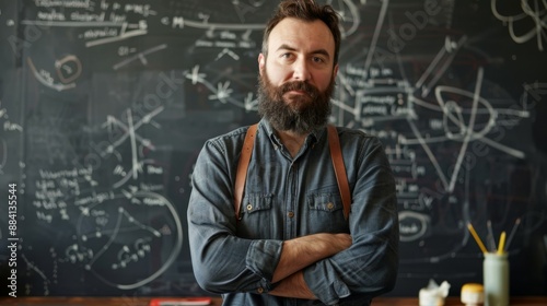 A scholarly man with a beard poses confidently in front of a blackboard covered in chalk writings and diagrams, conveying a sense of academic profundity and dedication to teaching.