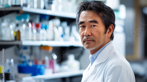 A scientist in a white lab coat standing confidently in a modern laboratory setting, surrounded by equipment and chemicals, symbolizing knowledge.