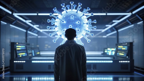 A scientist stands in a futuristic lab gazing at a digital representation of a virus