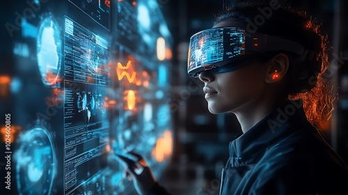 A scientist using augmented reality interfaces to assess atmospheric pressure changes and wind currents, floating 3D graphs and satellite imagery around them, futuristic office environment,