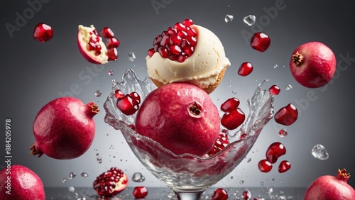 dessert, delicious, vibrant, floating, seed, fruit, fresh, red, healthy, summer, ice cream, droplet, vanilla, dynamic, indulgence, refreshment, movement, splash, water, burst, chilled, energetic, garnish, glass bowl, lively, pomegranate, grey background, clean