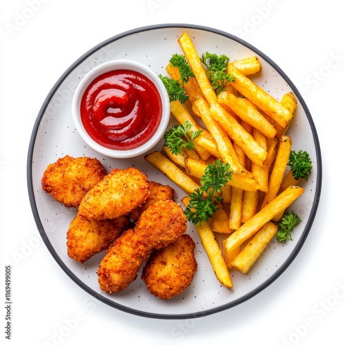 A scrumptious serving of chicken strips and French fries with ketchup, isolated on a clear background.
