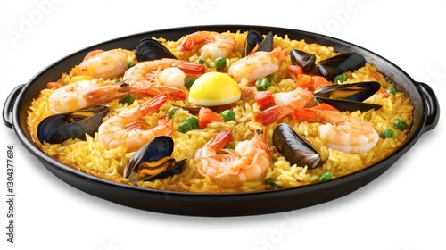 A seafood paella served in a traditional cast-iron pan, filled with shrimp, mussels, and saffron-infused rice.