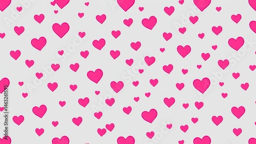 A seamless pattern featu numerous bright pink hearts scattered randomly on a light gray background ideal for Valentine's Day designs.