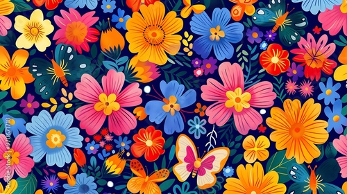 A seamless pattern of bright flowers and butterflies, arranged in a playful, repeating design with bold lines and vivid hues. 8k UHD, suitable for high-quality printing or digital display.