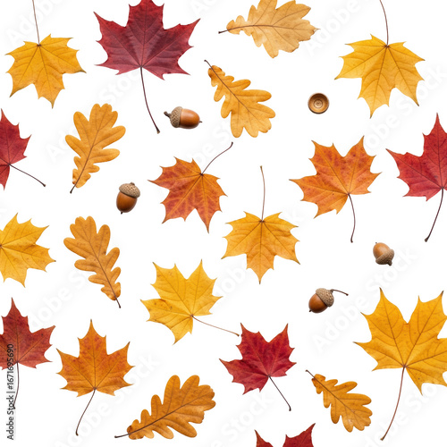 A seamless pattern of colorful autumn maple and oak leaves with acorns, perfect for fall season designs, backgrounds, or seasonal promotions.