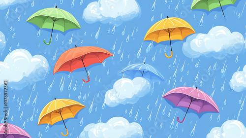 A seamless pattern of colorful umbrellas in the sky, with raindrops falling, creating an atmosphere suitable for summer activities