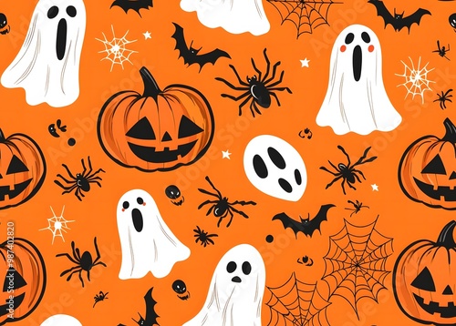 A seamless pattern of cute ghosts, pumpkins, and spider webs