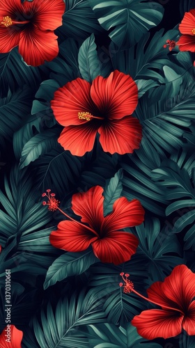 A seamless pattern of dark red hibiscus flowers and leaves, on a deep navy background, with a vibrant color scheme, phone wallpaper