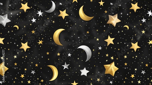 moon, star, pattern, seamless, night sky, space, gold, black, background, design, art, illustration, cosmic, galaxy, astrology, celestial, dreamy, magical, vintage, fabric, wallpaper, textile, print, graphic, digital, repeat, seamless pattern
