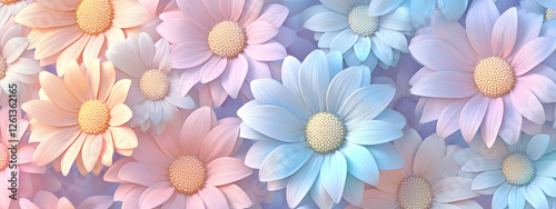 A seamless pattern of pastel rainbow daisies, their petals glowing with soft hues