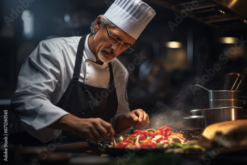 A seasoned chef, donning a chef's hat and uniform, prepares a fusion dish blending flavors from various global cuisines, representing the beauty of culinary innovation. Generative Ai.