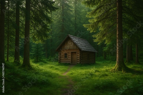 A secluded wooden cabin rests serenely amidst a lush green forest filled with tall trees