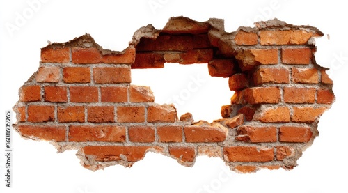 brick, wall, hole, damaged, section, red, orange, mortar, grunge, texture, construction, architecture, exterior, ruin, empty, destruction, broken, masonry, fragment, gap, evacuated, crater, exposed, reconstruction, uneven, rough, irregular, pattern, background, graphic, image, design, element, isolated, white, blank
