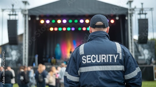 A security guard wearing a security jacket stands in front of a stage with colorful lights and blurred background,