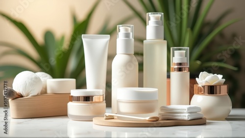 A selection of elegant, light beige and white cosmetic containers, arranged on a marble surface, against a backdrop of greenery.
