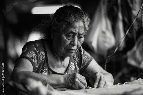 A senior woman is deeply concentrated on her embroidery work in a monochrome image