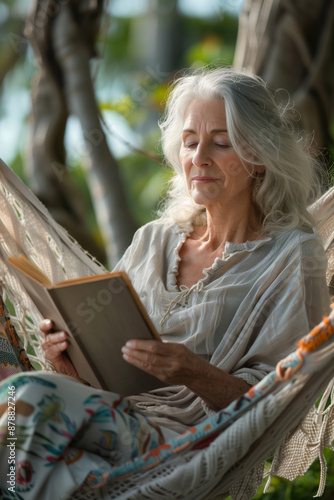 A Serene Afternoon in the Hammock: An Elderly Woman Finds Tranquility While Reading
