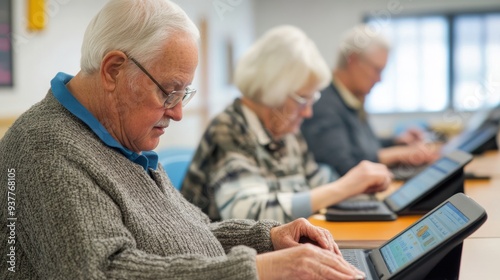 A serene and focused image of a small group of seniors in a technology class, each one attentively following along with their tablets as the instructor guides them through a step-by-step tutorial,