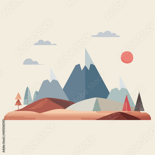mountain, landscape, flat, design, nature, stylised, serene, peace, smooth, inspiration, vista, peaceful, earth, quiet, graphic, ridge, explore, pristine, creativity, summit, palette, tranquil, vibrant, wood, warm, geometry, idylli, peak, panoramic, wallpaper, land, forest, cloud, modern, art, sun, terrain, abstract, wilderness, minimalist, clean, calm, picturesque, hike, cloud, concept, sky, evergreen, peak