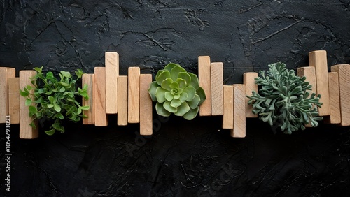 A serene arrangement of green plants and natural wooden blocks set against a textured black background