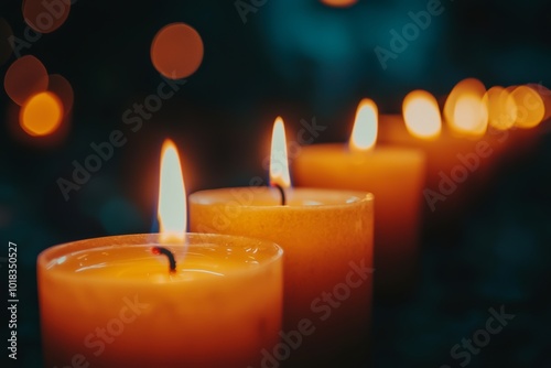 A serene arrangement of lit candles casting a warm glow, creating a calming and inviting atmosphere in a darkened setting
