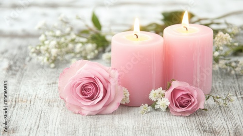 A serene arrangement of lit pink candles surrounded by soft pink roses on a rustic wooden surface, ideal for use in romantic or calming decor, wellness, or event promotion,