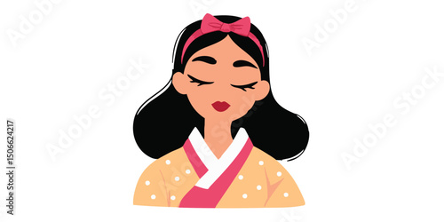 asian woman, serene, tranquil, peaceful, graceful, calm, relaxed, woman, female, portrait, illustration, drawing, art, design, fashion, culture, korea, beauty, elegant, pretty, stylish, delicate, hair, face, eyes closed, serenity, calmness, composure, gentle, soft, feminine, aesthetic, artistic, graphic design, cartoon, avatar, digital artwork, cute
