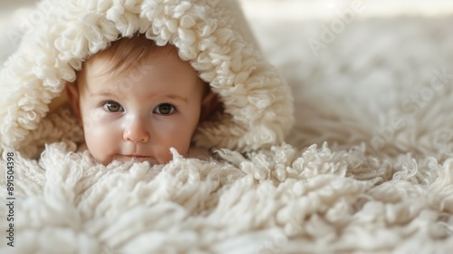 A serene baby peeks out from under a cozy, fluffy blanket. The infant's expression reflects peace and gentle curiosity in this soft, intimate moment captured perfectly.