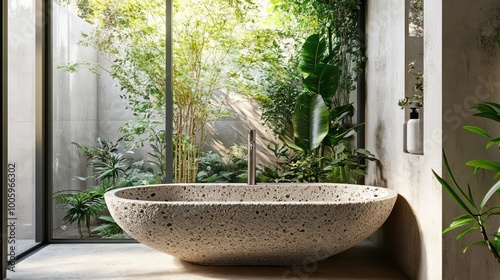 A serene bathroom featuring a stone bathtub surrounded by lush greenery and natural light.