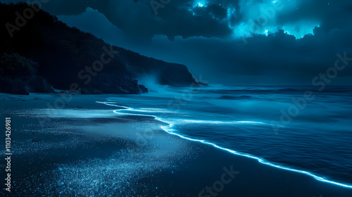 A serene beach at night lit by glowing bioluminescent waves