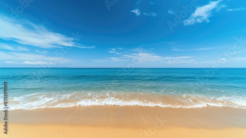 A serene beach with golden sand and a calm blue ocean, with a clear area of sky above for text