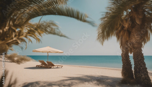 serene, beach, gold, sand, sun, lounger, parasol, lush, mediterranean, landscape, tranquil, ocean, coastline, relaxation, coastal, scenery, tropical, summer, paradise, calm, environment, resort, sunny, clear, water, vacation, shade, escape, idylli, view, leisure, retreat, horizon, pristine, natural, beautiful, peaceful, palm, sea, tree, island, sky, travel, nature, palm tree, caribbean, holiday