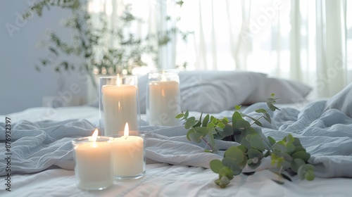 A serene bedroom scene with multiple lit candles and eucalyptus arranged on a neatly made bed, bathed in soft, natural light, creating a calming, tranquil setting.