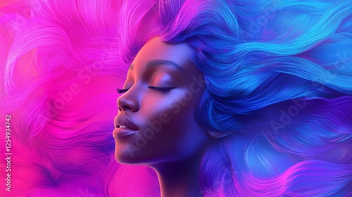 A serene Black woman with vibrant, flowing hair in shades of pink and blue, set against a colorful backdrop.