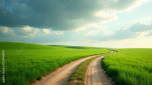 country road, dirt road, winding road, greenfield, meadow, rolling hills, cloud, cloudy sky, sunlight, landscape, nature, rural, scenic, pastoral, tranquil, serene, peaceful, calm, open space, horizon